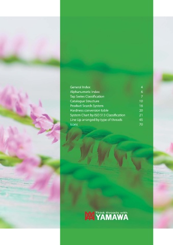 General Index 4 Alphanumeric Index 6 Tap Series Classifi cation 7 Catalogue Structure 10 Product Search System 16 Hardness conversion table 20 System Chart by ISO 513 Classifi cation 21 Line Up arranged by type of threads 45 Icons 70