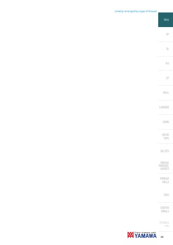 LineUp arranged by type of thread Intro SP SL PO ST ROLL CARBIDE LONG HAND TAPS EG (STI) SPECIAL THREADS, GAUGES THREAD MILLS DIES CENTER DRILLS Technical info 69