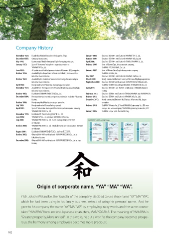 December 1937: Company incorporated. October 2003: Obtained ISO14001 certifi caiton in YAMAWA Mfg. Co.,Ltd.